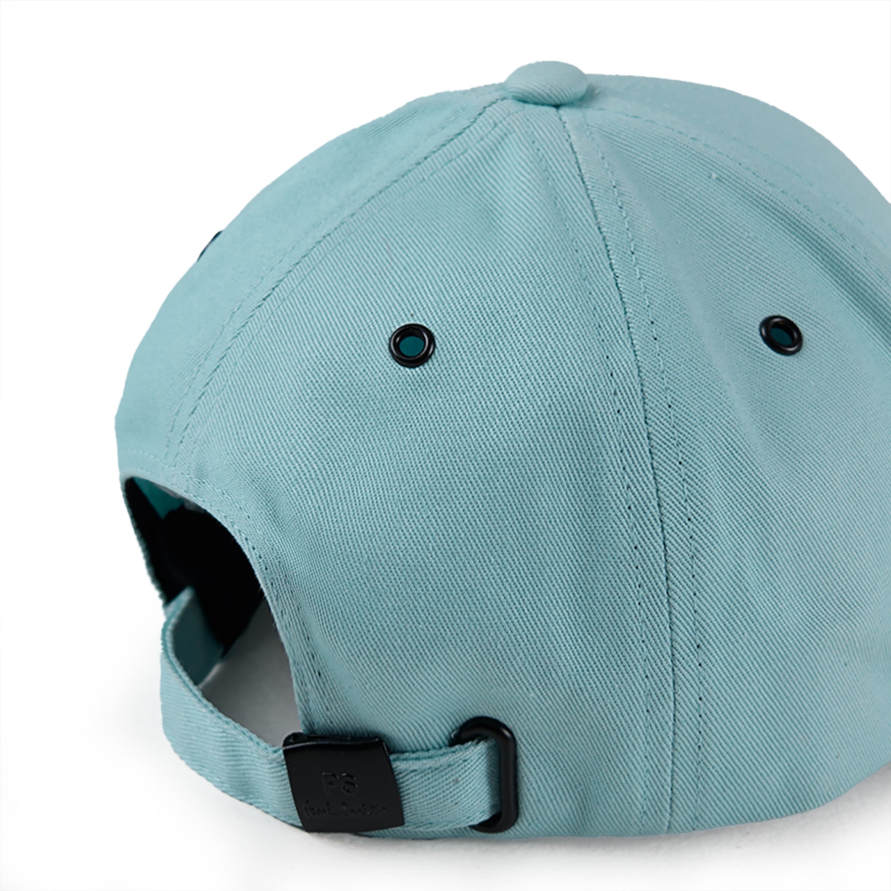 Made from 100% cotton, this teal baseball cap features Paul Smith's classic Zebra logo embroidered on the front. This cap is finished with a black inner band and eyelets for ventilation.