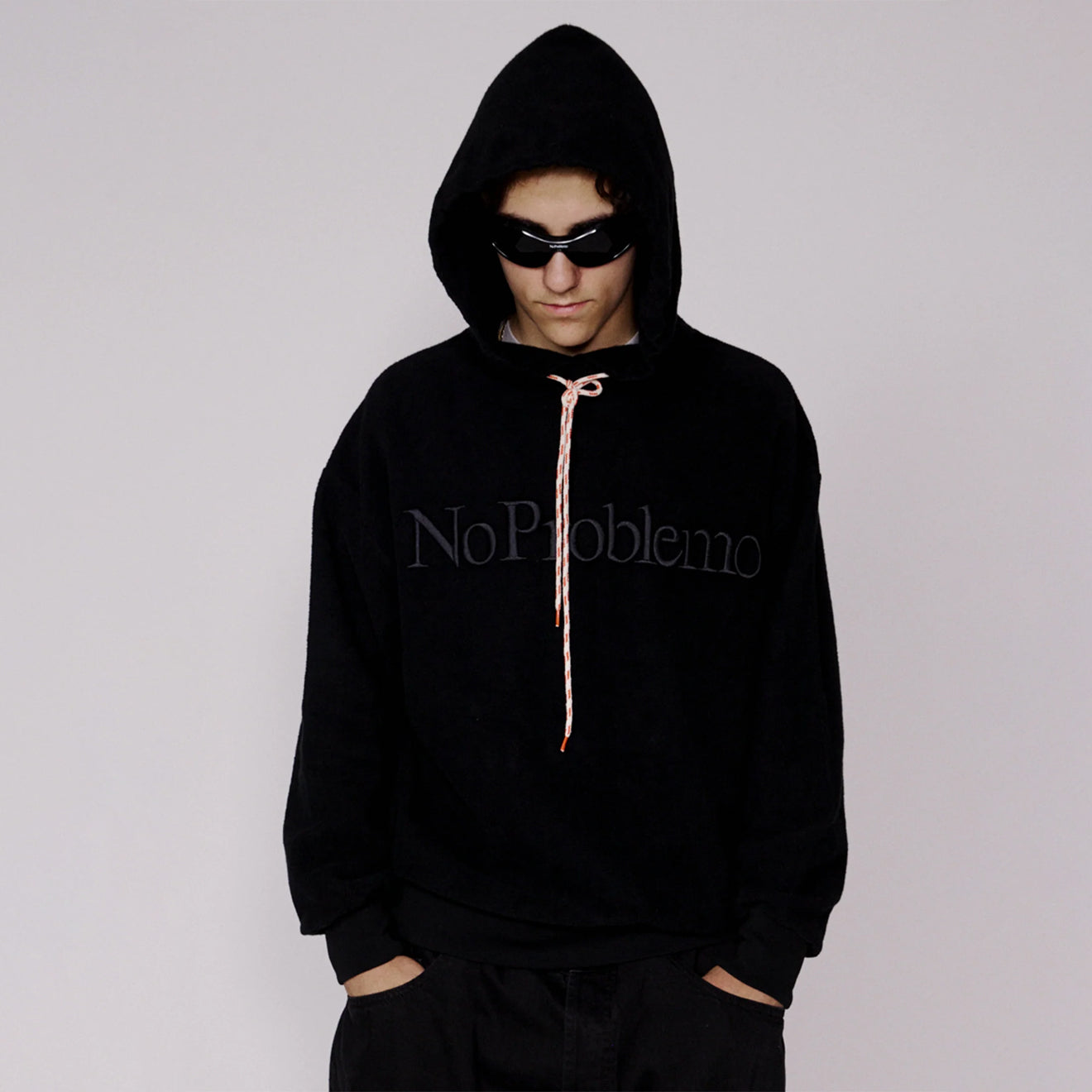 Regular price £149.00 £119.20 Save 20% Sale priceThe No Problemo Reverse Fleece Sweatshirt in Black is a hooded sweatshirt made from brushed-back 100% cotton jersey fleece.