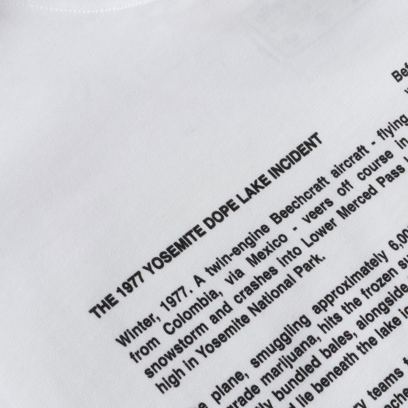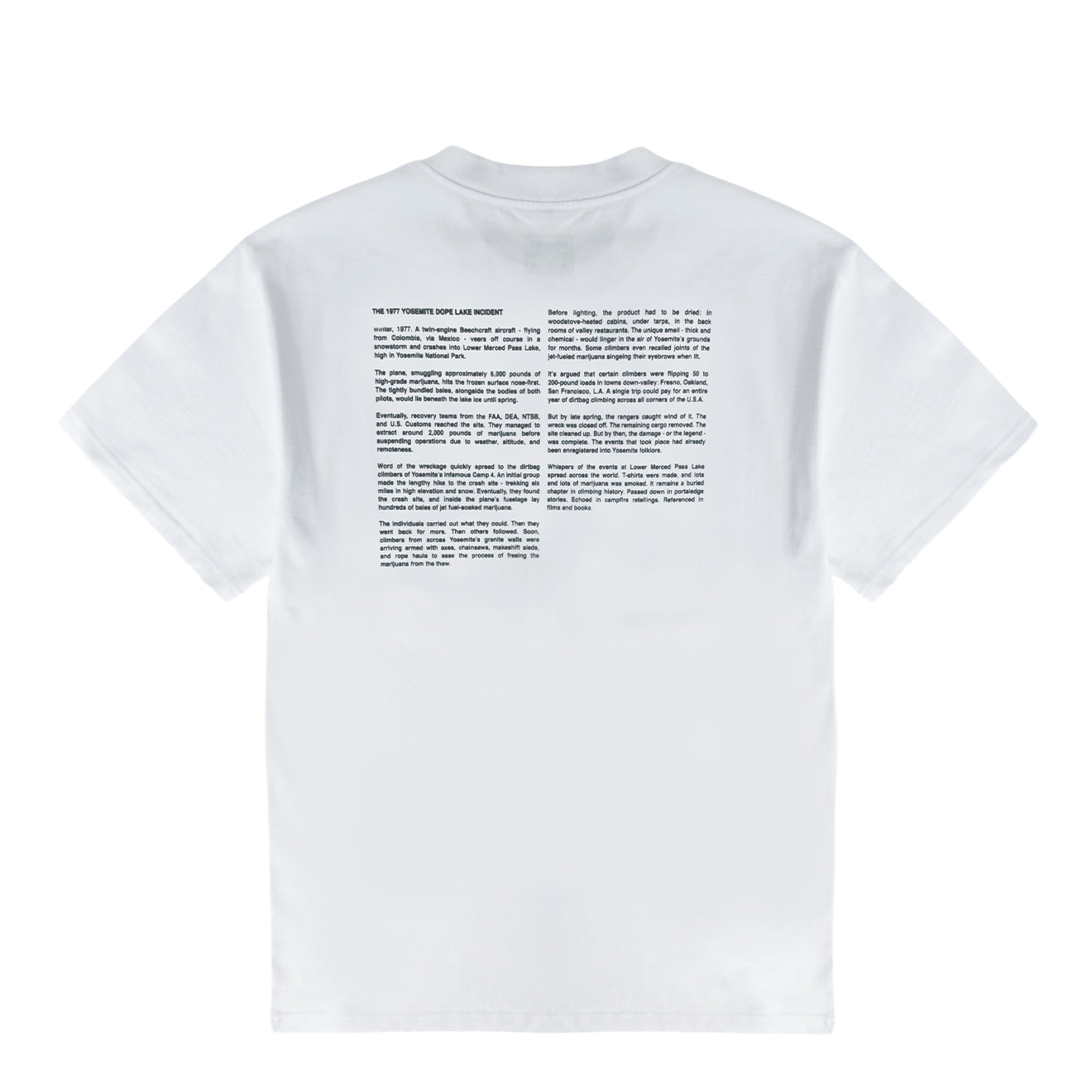 Regular price £35.00 £28.00 Save 20% Sale priceThe Hikerdelic Dope Lake T-Shirt in White tells the story of the 1977 Yosemite airplane crash, famously known as Dope Lake. This slightly boxy t-shirt is printed in the North West of England and combines casual comfort with a design inspired by climbing folklore. Perfect for everyday wear, it adds a unique story-driven touch to your wardrobe.