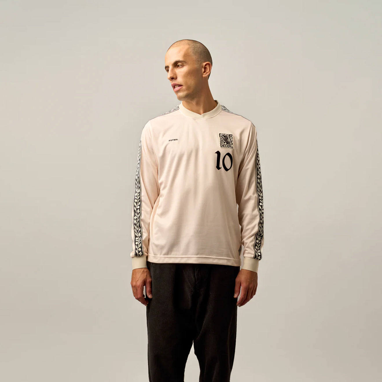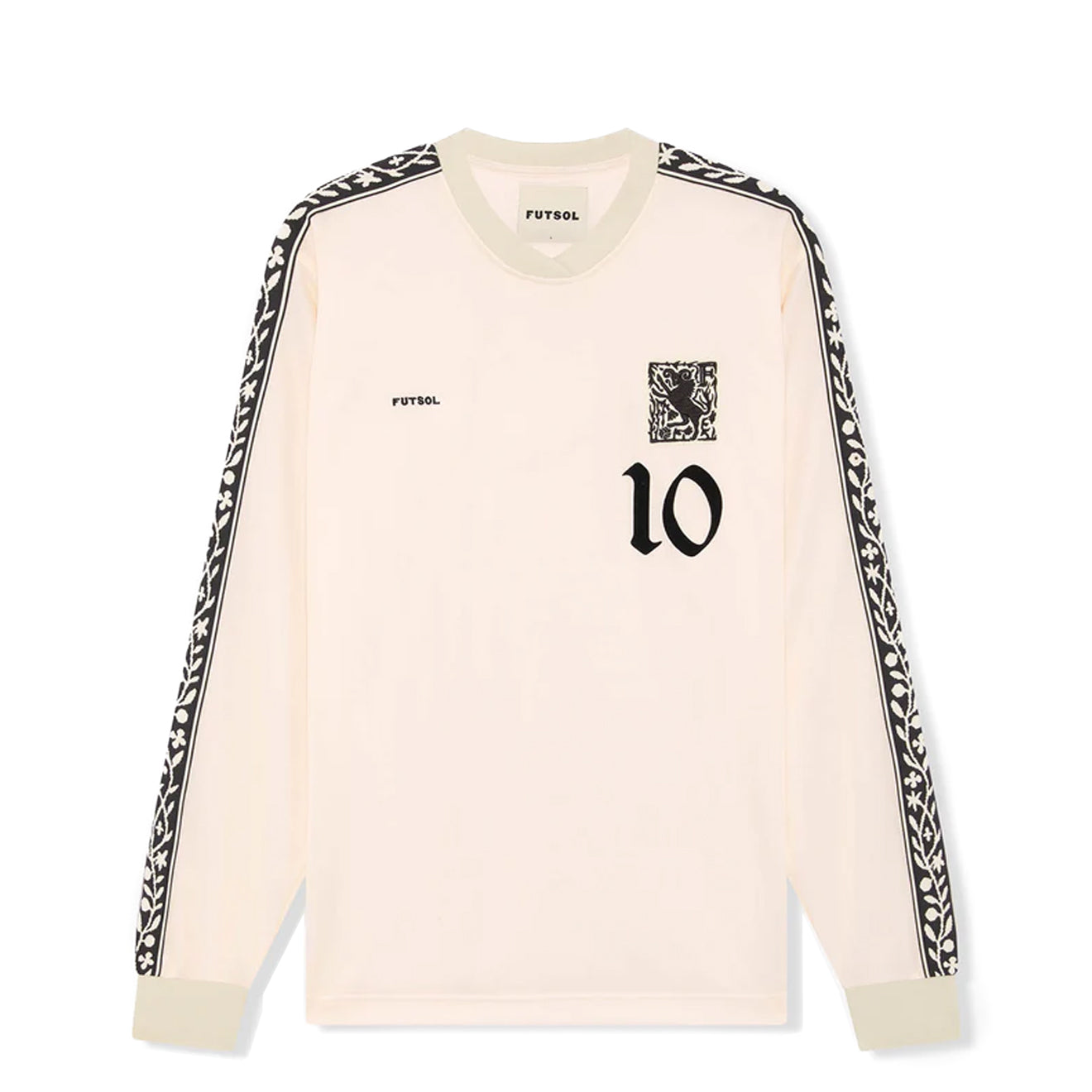 Regular price £150.00 £120.00 Save 20% Sale priceEmbrace tradition and contemporary design with the Futsol Long Sleeve Jersey in Cream Ram. Inspired by British folklore and antique book borders, this jersey features centaury flowers and autumnal berries running down the sleeves. A hand-drawn Derby Ram crest sits above the number 10, paying homage to the mythical roots of the game.