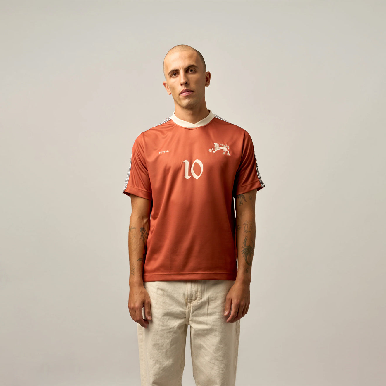Celebrate the heritage of folk football with the Futsol Short Sleeve Jersey in Rusty Lion. Inspired by community matches and ancient sporting folklore, this jersey features hand-drawn floral trims, folklore-style embroidery, and a classic flock print for a timeless, nostalgic look with modern performance.