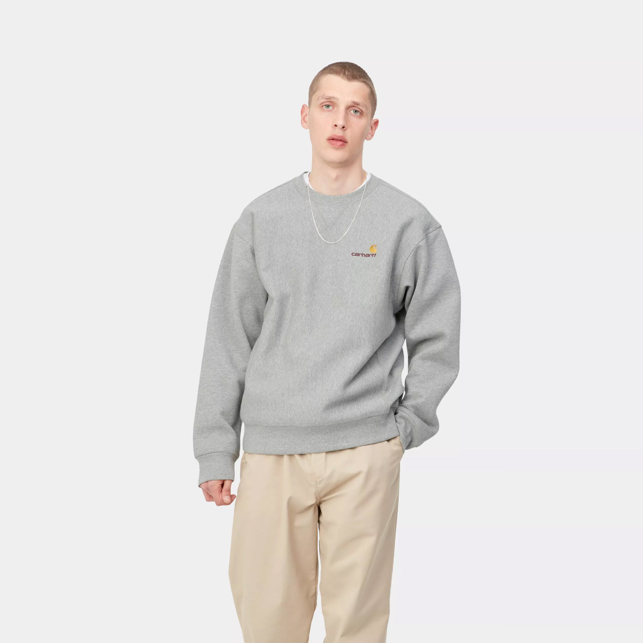 Regular price £80.00 £64.00 Save 20% Sale priceThe Carhartt WIP American Script Sweat in Grey Heather is crafted from heavyweight cotton-poly jersey with a brushed, fleece-like backing. Cut in a loose fit, it features a classic crewneck, ribbed cuffs, hem and side panels, and is finished with the signature American Script embroidery at the chest.
