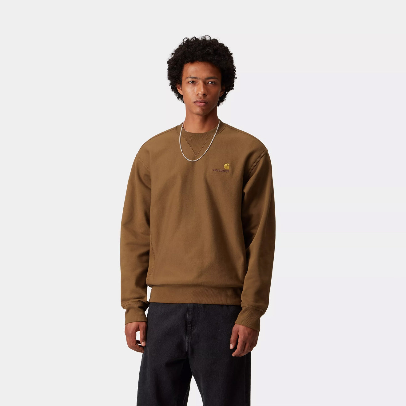 Regular price £80.00 £64.00 Save 20% Sale priceThe Carhartt WIP American Script Half Zip Sweatshirt in Hamilton Brown is made from a heavyweight cotton-poly blend with a soft, brushed backing for warmth and comfort. Cut in a loose, boxy fit, it features a high neck with zip closure and a small embroidered logo at the chest.