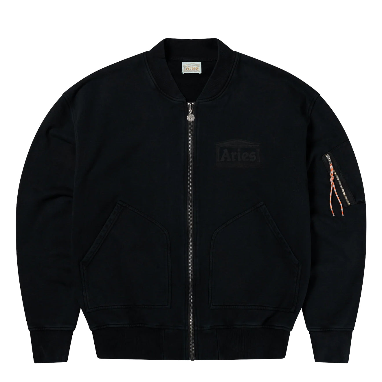 The Aries Premium Faded Temple Bomber in Black is a sweat zip-through bomber made from heavy brushed-back cotton jersey fleece. It features a 2-way roman coin zip front, large front pockets, and a zip pocket on the left sleeve, finished with a faded vintage look and an ancient Aries temple screen print on the chest.