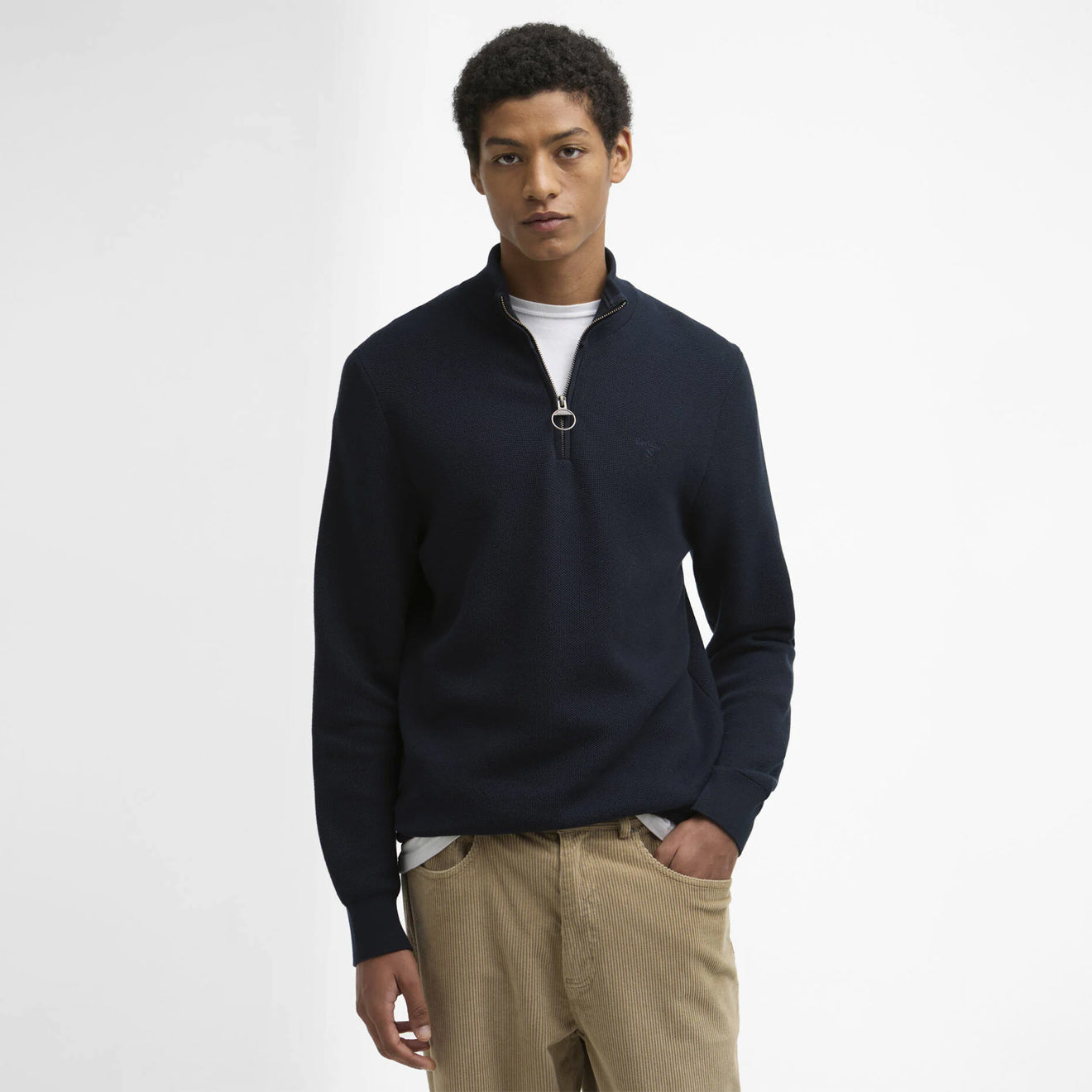 Regular price £99.95The Barbour Essential Honeycomb Quarter-Zip Jumper in Navy is designed as a stylish, modern layering essential. Crafted from soft cotton with a honeycomb knit, it combines a sharp, tailored fit with ribbed trims and subtle Barbour detailing.