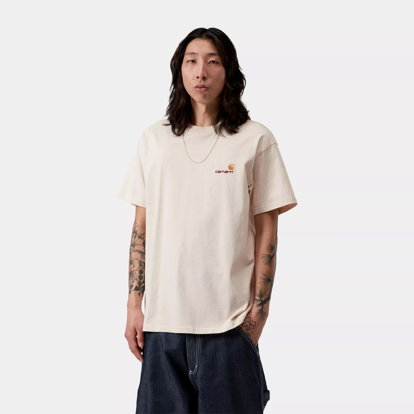 Regular price £35.00The Carhartt WIP S/S American Script T-Shirt in Natural is a relaxed essential built from premium organic cotton jersey. Weighing 240 g/sqm, the midweight single jersey fabric gives the tee a substantial hand feel while maintaining breathability. Cut in a loose fit with short sleeves, it is completed by the brand’s iconic two-tone American Script embroidery across the chest.