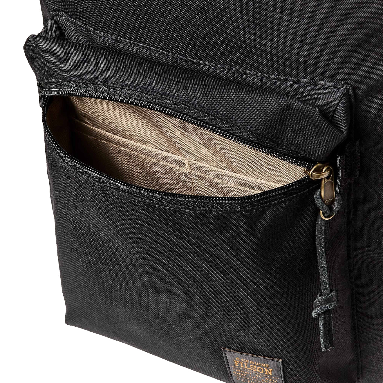 Regular price £185.00 £148.00 Save 20% Sale priceThe Filson Surveyor 25L Backpack in Black blends rugged durability with lightweight design. Made from 500D and 1000D waxed Cordura nylon, it resists abrasion and repels water while carrying up to 25 litres of gear. Padded shoulder straps, a contoured back panel, and an adjustable sternum strap ensure comfort and stability, while dedicated laptop and stow pockets keep essentials organised.
