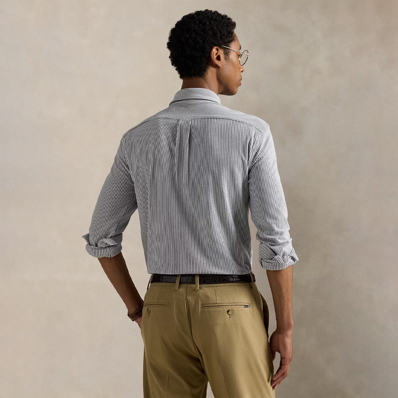 - Button-down collar with buttoned placket