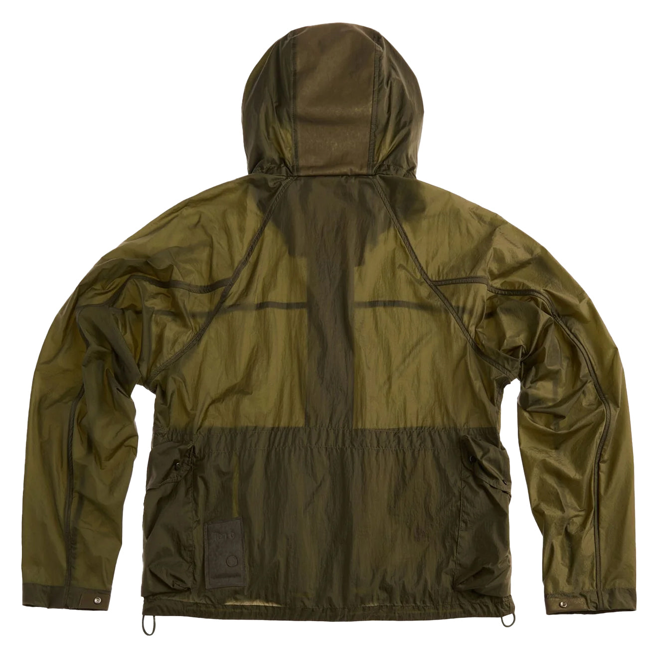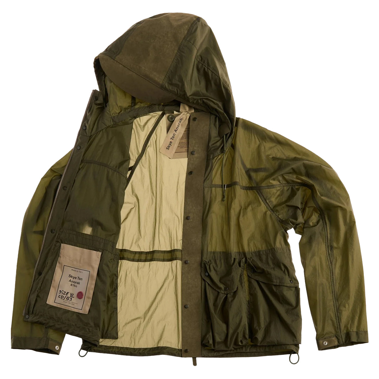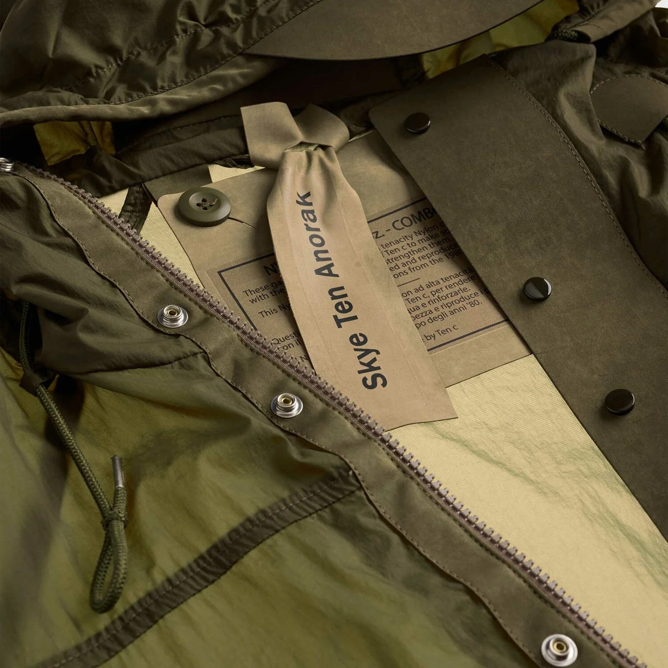 Regular price £750.00The Ten C Skye Ten Anorak in Olive Green is a functional outer layer designed with Ten C’s signature attention to detail and technical performance. Crafted from durable OJJ nylon fabric, it is water-resistant and garment dyed for a rich, lived-in finish that develops character over time. The pullover design features a hidden front zip beneath a snap-button placket, offering clean lines and added protection from the elements. A three-piece drawcord hood, adjustable waist and snap-button cuffs allow for a personalised fit, while multiple front pockets provide practical everyday storage. Finished in a regular fit, this anorak balances utility, comfort and understated style.